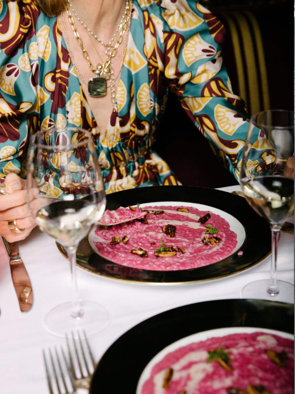 LaDoubleJ is an open window on the creative vision of JJ Martin, the founder of the brand, made of lively patterns and vibrant colours, such as the pink of the beetroot risotto she ordered for lunch at our restaurant. During our encounter, she told us about her job and the strong bond with spirituality, as well as sharing several anecdotes and memories related to her experience at Giacomo Milano.